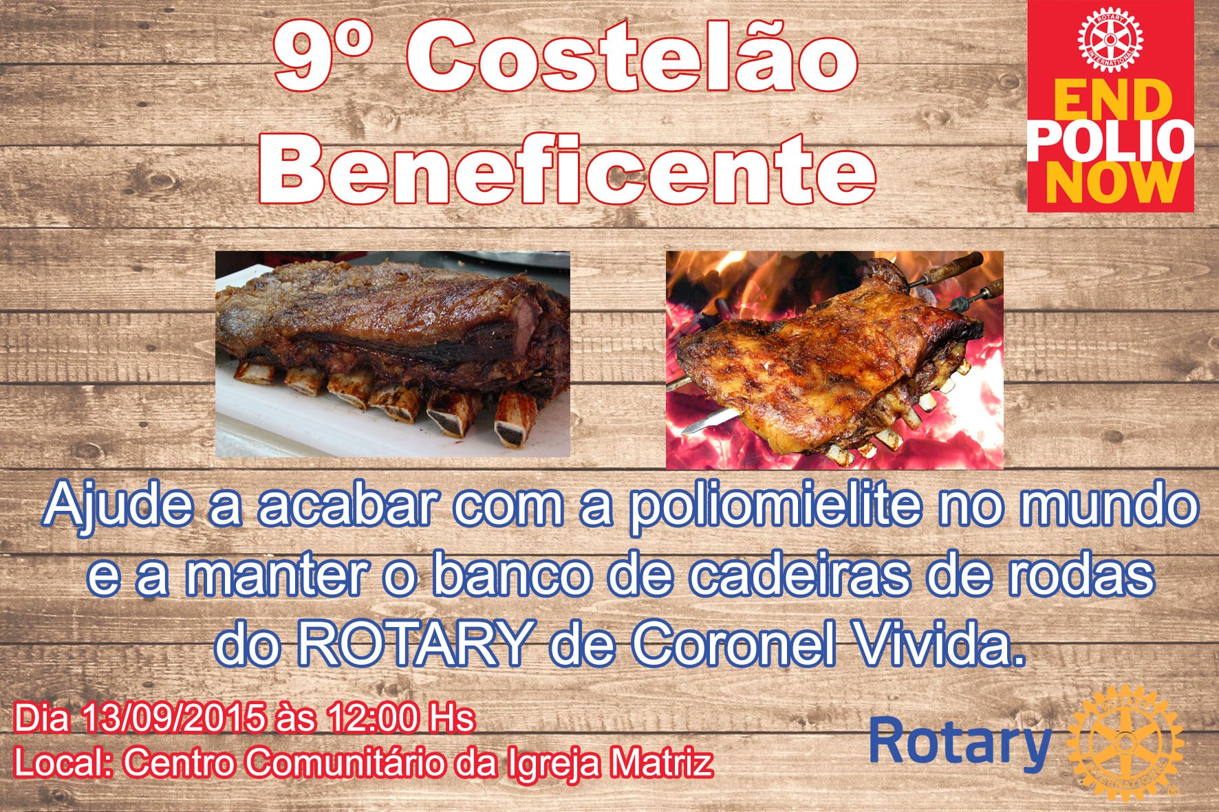 O Rotary Club de Coronel Vivida, convida a todos para participar do 9 (nono) Costelão do Rotary, que será realizado no próximo dia 13/09/2015 a partir das 12:00 horas no Centro Comunitário da Igreja Matriz. Coronel Vivida-PR.